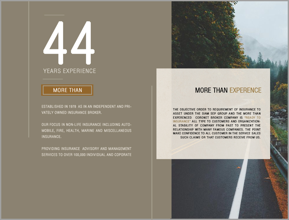 จากประสบการณ์การทำงานในวงการด้านการประกันภัยมานาน 44 ปี เราตระหนักเสมอว่าการประกันภัย ไม่ใช่แค่เรื่องของความคุ้มครองลูกค้าตามกรมธรรม์ แต่ยังหมายถึงความเชื่อมั่นในเรื่องของการให้บริการและการดูแลลูกค้าอย่างห่วงใยด้วยความจริงใจ สมดังปณิธานในการทำงานของเราคือ More than Insurance